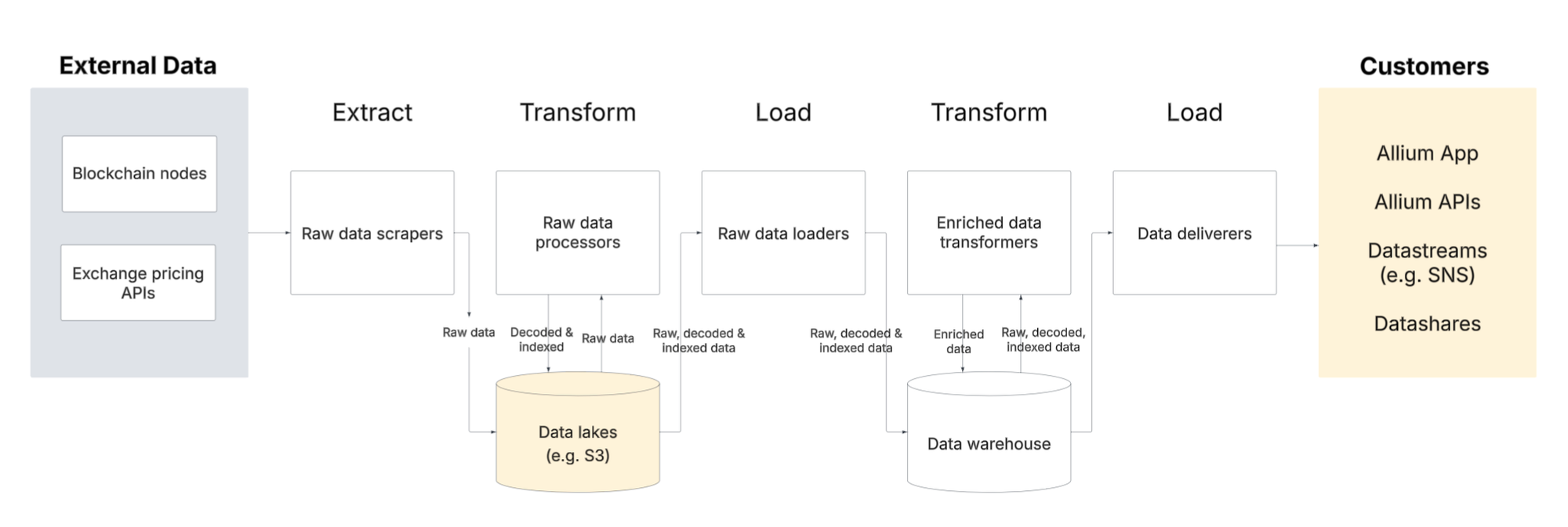 For example, this is a high level view of how Allium ingests, cleans, and serves data: